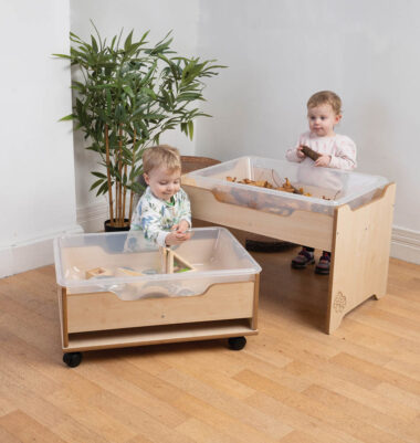 A low leveled double messy play unit designed for under 2’s, supplied with two strong removeable trays. Ideal for play sand, fine sand, water play and exploration activities. The lower unit is fitted with castors and can be stored under the larger unit when not in use. A practical, open