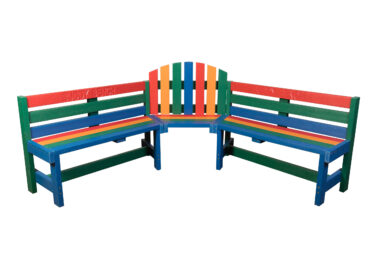 The recycled plastic Buddy Bench is a curve design to make conversation easier and to encourage non-verbal communication, such