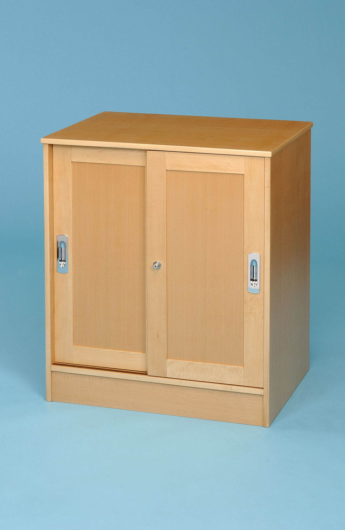 • A medium shaker style lockable cupboard complete with shelving and space saving sliding lockable doors.