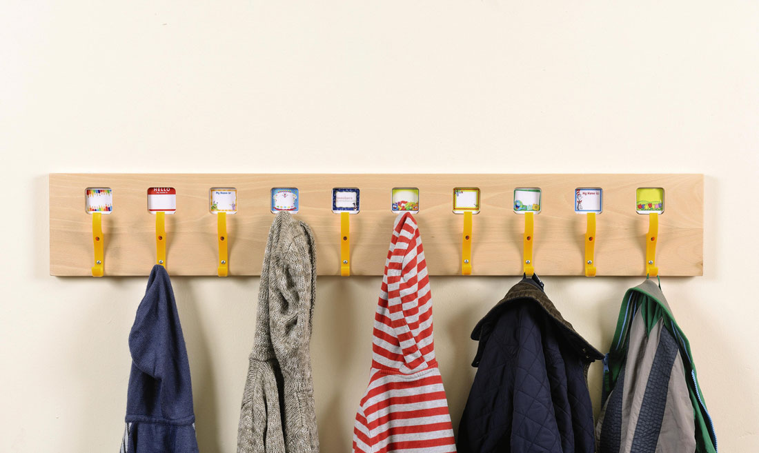 Individual high quality coat hooks on a 1200mm beech finish coat rail. Each hook has its own ‘pocket’ for a photograph or character image recognisable to the child.