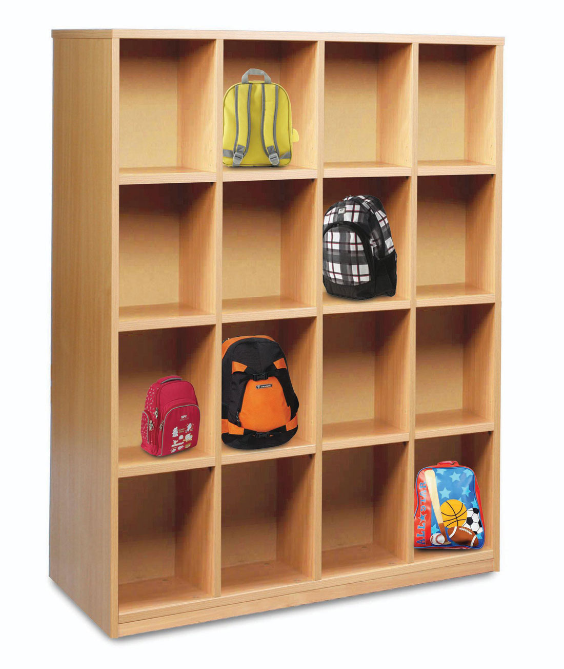 Simple, sturdy bag storage units with 16 compartments.