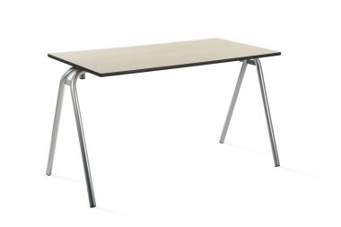 The GEO student table is a chunky hard wearing table with an attractive, stackable angled leg frame in a textured silver finish. There is an 18mm tabletop with a choice of edging styles