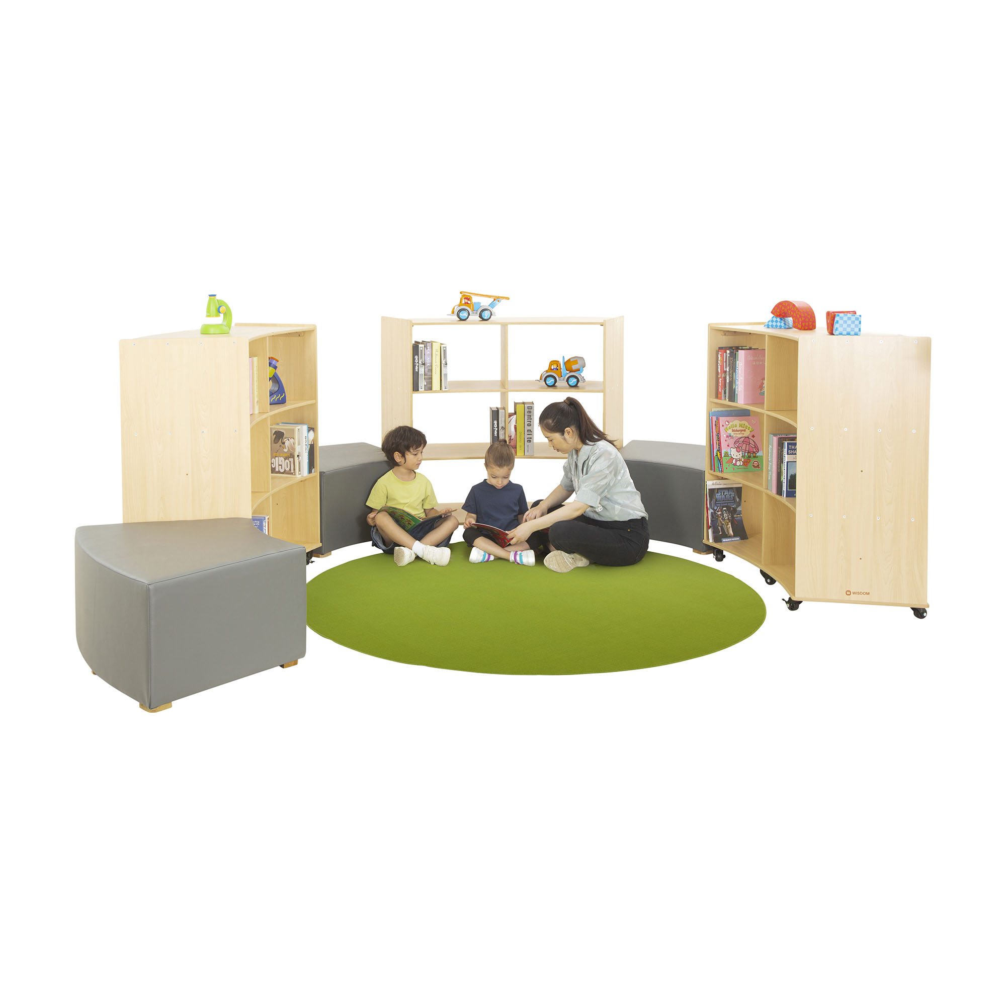 Sturdy curved mobile bookcase in an attractive natural finish alongside a high quality PVC covered ottoman seat, designed to withstand the rigours of daily use.