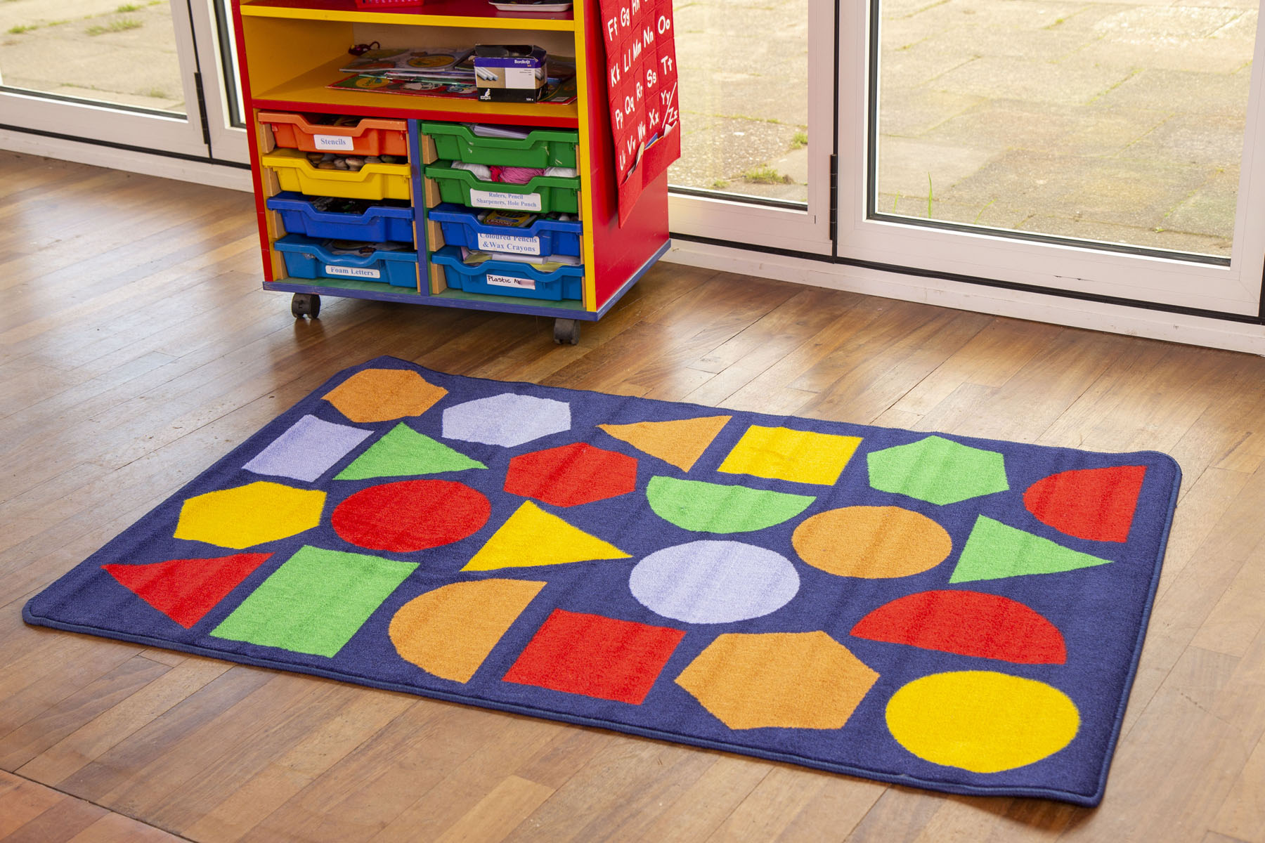 Small 1.5m x 1m nursery carpet with geometric shape design, helps young children familiarise themselves with shapes and spaces.