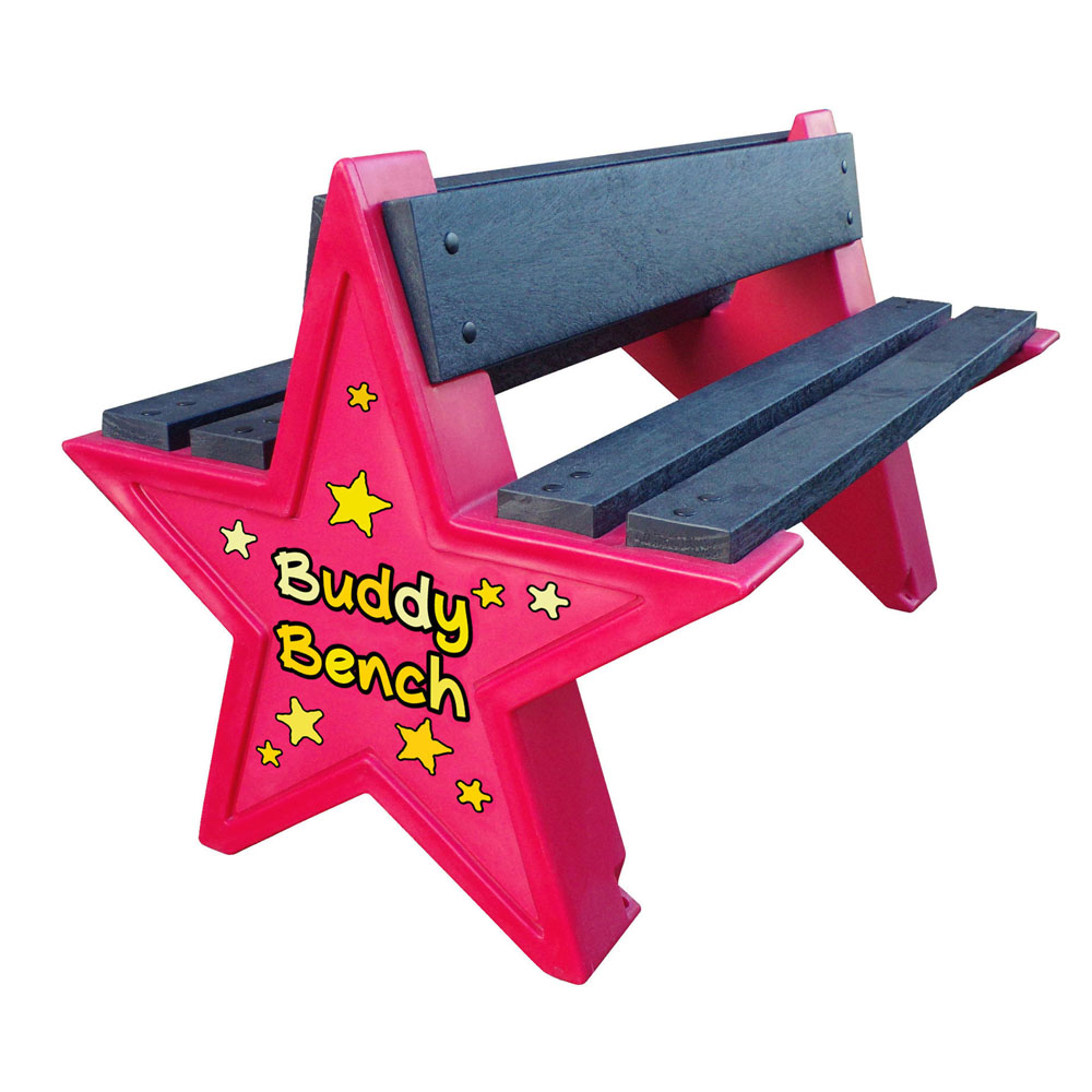 The outdoor 4 person Buddy Star Bench is over 60% recycled by weight. Supplied in a wide range of colours with ‘Buddy Bench’ graphics on each side.