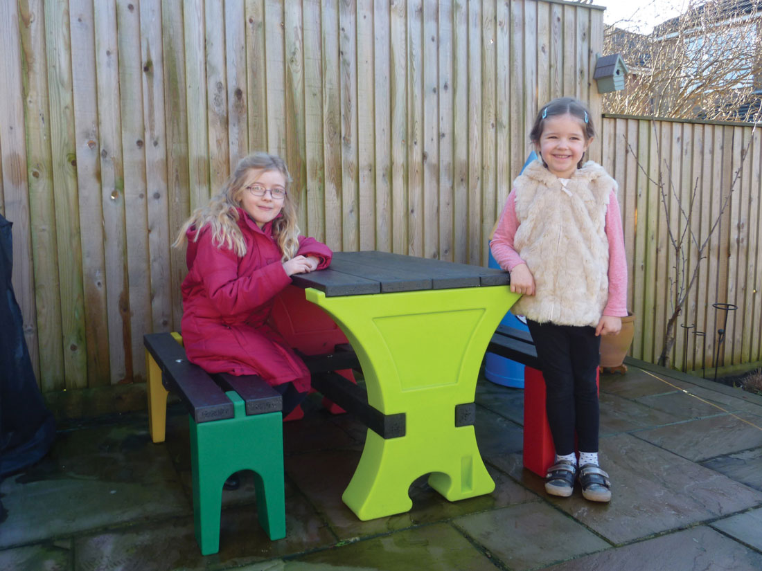 Junior height multicoloured table and bench set made from 100% recycled material.