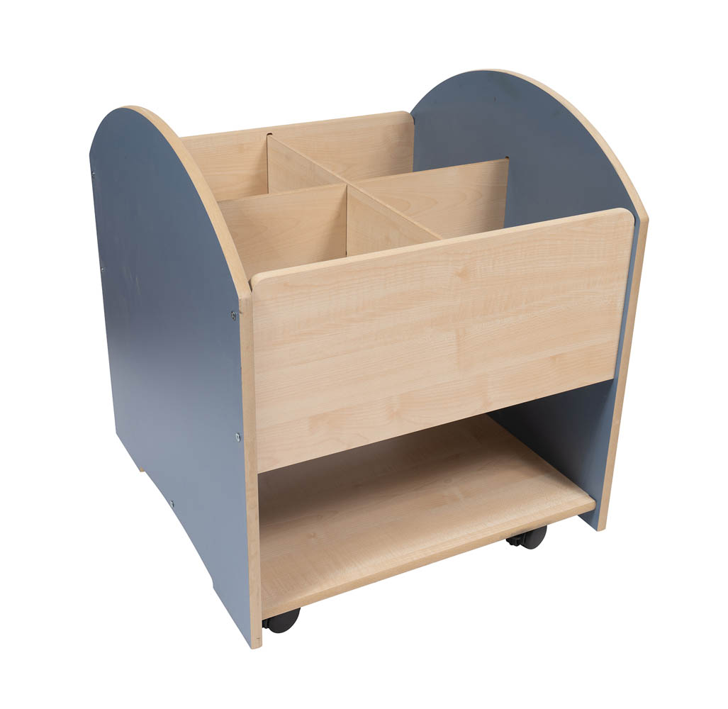 A range of durable high-quality kinderboxes fitted with castors for easy moving. Stylish curved side panels in a stormy blue finish with deep storage compartments designed to accommodate a variety of different sized items and therefore maximise storage. Available in three sizes, the taller units also have an under shelf for additional storage.