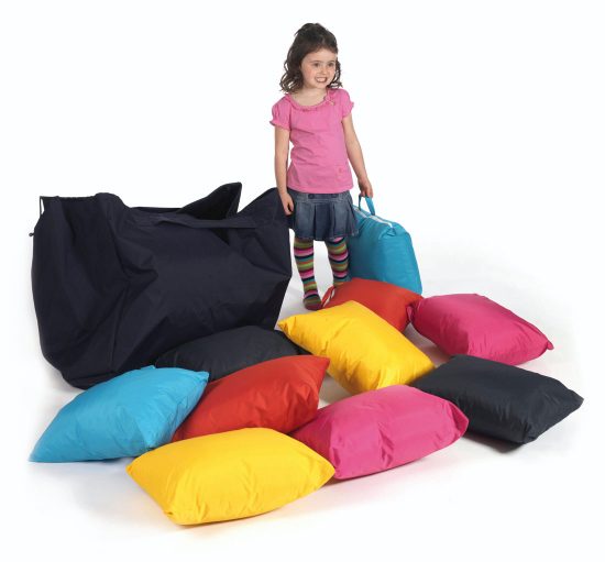 Pack of 10 multi-coloured floor cushions with carry bag, the showerproof fabric means these can be used outdoors as well (must be stored inside)