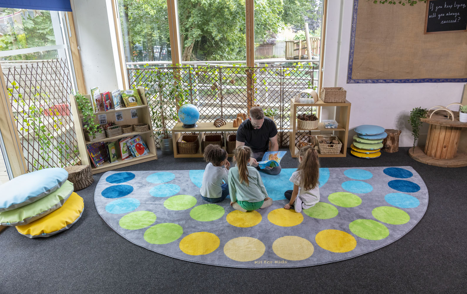 Large 4x2m semi-circle carpet with calming Lake inspired placement spots.