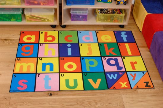 A giant alphabet play mat with 24 squares showing all 26 lowercase letters. Ideal for group use, literacy work, or general use as a classroom carpet. Rubber backed felt.