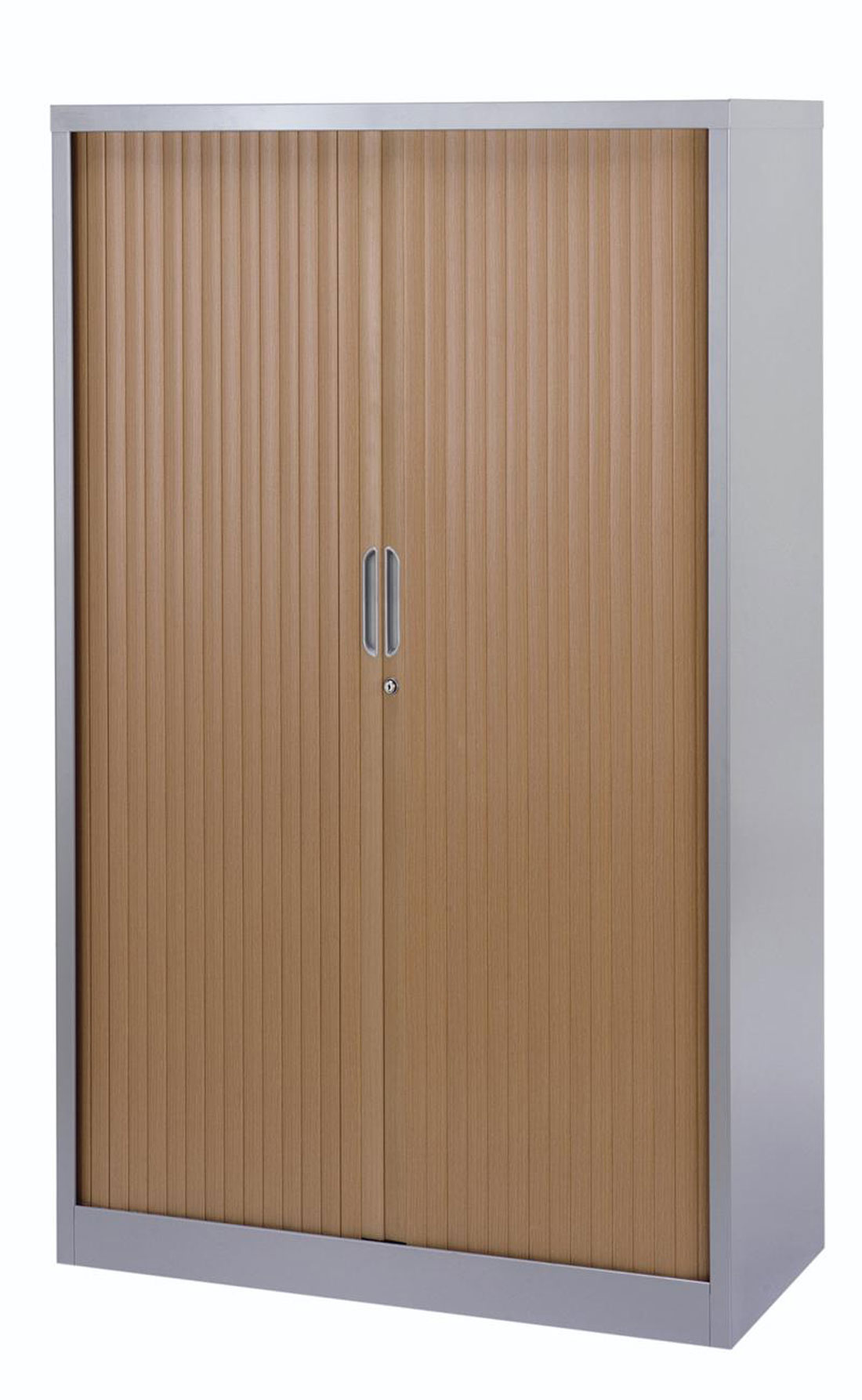 Side opening steel tambour unit 1000mm wide, manufactured with cruciform base to create a highly rigid unit and a welded carcass to give greater strength, available in a choice of heights and different door and carcass finishes, supplied empty ready to take storage fitments as listed.